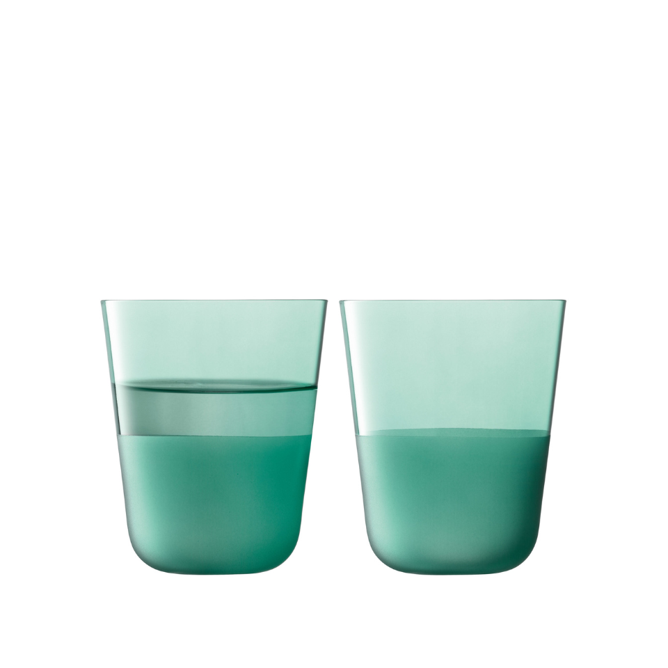 A set of two tumblers with rounded bases, softly tapered profiles, and a matte textured finish to the lower half. A versatile shape for water or long cocktails. Made from soda-lime glass for clarity and strength, and designed for everyday.