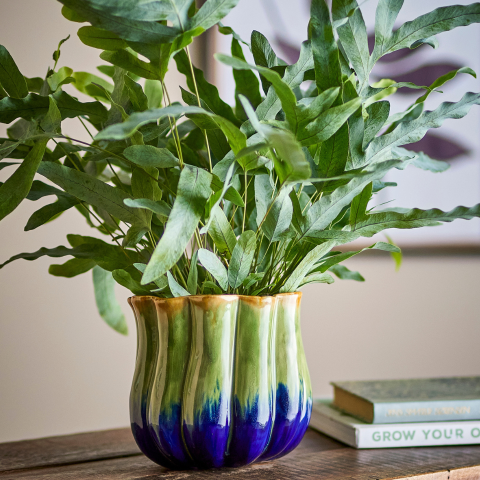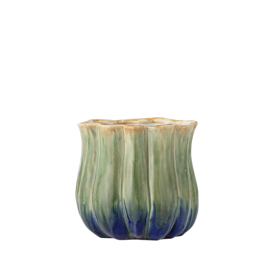 The Jenner Flowerpot by Creative Collection is a stoneware design finished with a reactive glaze that gives rise to subtle shifts in surface and tone. The gently rippled shape features vertical grooves and a blend of green and blue at the base with beige accents near the rim. Small variations in pattern and color intensity may occur, making each piece unique.