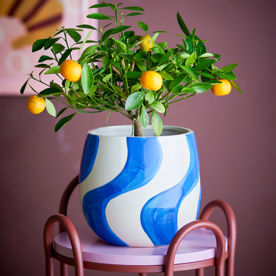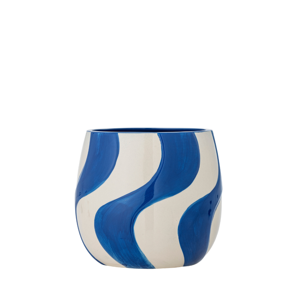 The Romy Flowerpot by Bloomingville is made of stoneware and hand-painted with wavy blue brushstrokes. The hand-painted finish can cause variations, making each one unique.