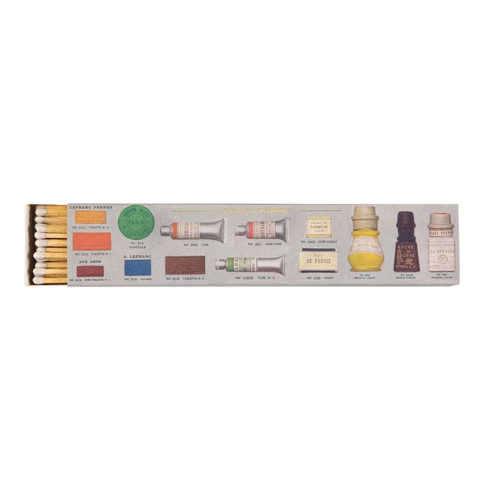 The Archivist Gallery's  long matchbox featuring artists' paint tubes and swatches that will make the perfect gift for any budding artist with a touch of gold foiling that adds to the creativity. Designed by The Pattern Book.