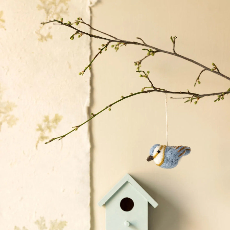 The blue Spinus bird is full of song and spring mischief. It’s a cheerful pop of colour for your Easter arrangements or window. Designed in Denmark by Gry & Sif and handmade in Nepal by skilled Nepalese women in 100% Wool. Gry & Sif is a Fair Trade certified company. Decorative use only, this item is not a toy.